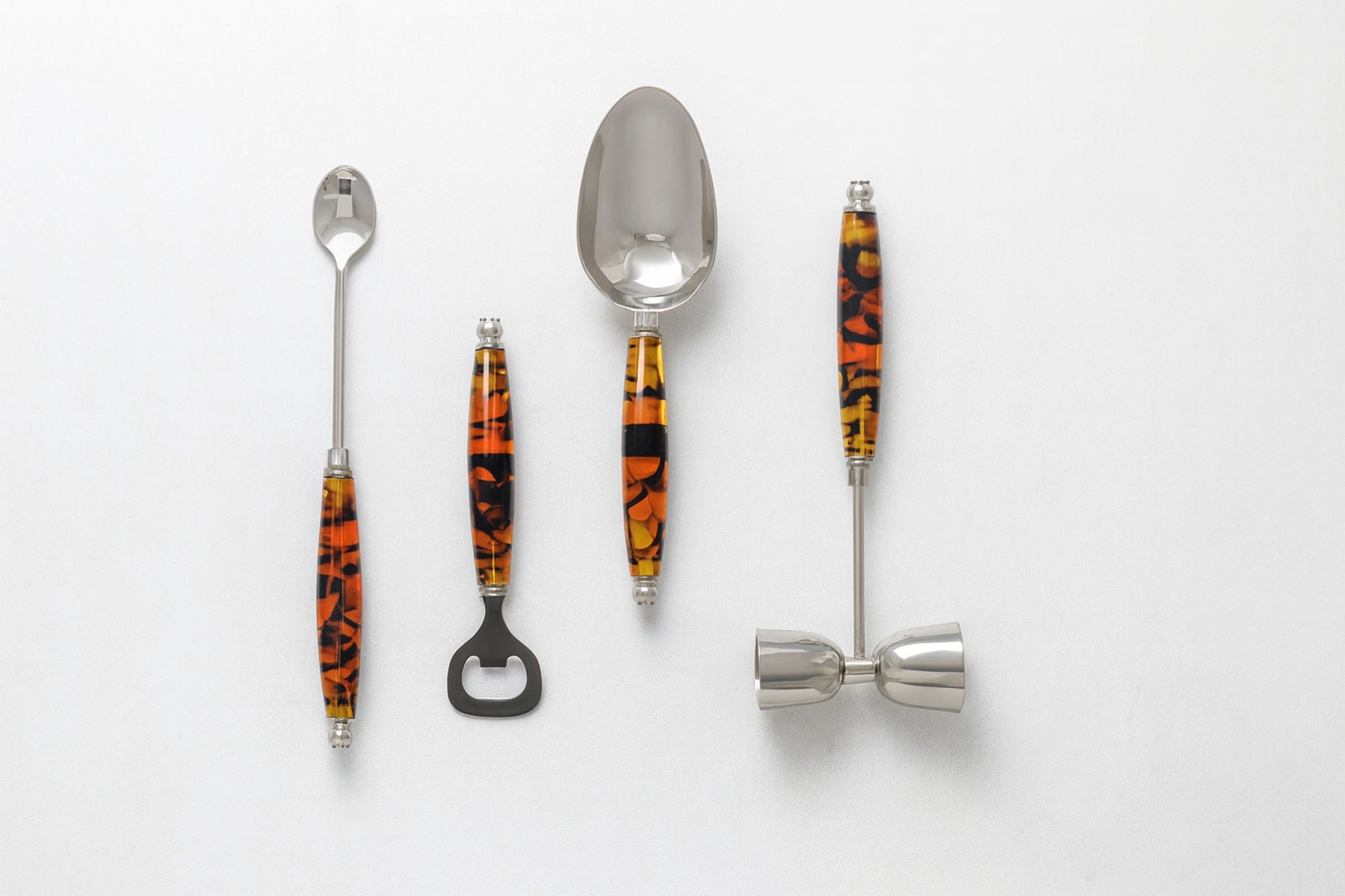 Stylish bar tool set with amber-patterned handles and stainless-steel stand, perfect for elegant cocktail making.