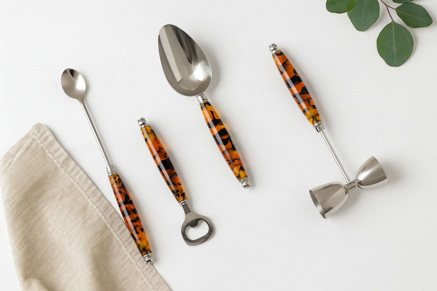 • Premium 4-piece bar tool set with tortoiseshell-pattern handles.