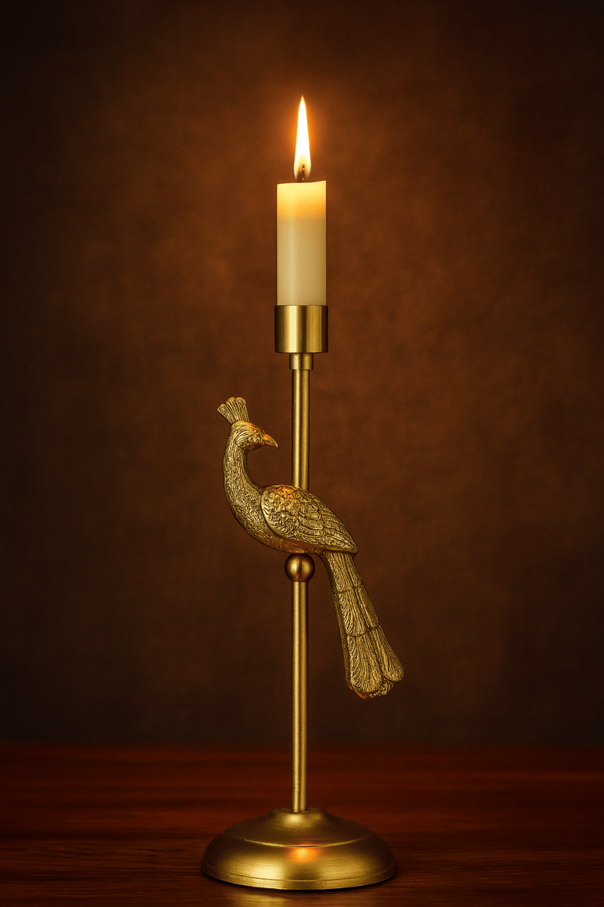 This elegant candle holder showcases a beautifully crafted golden peacock perched gracefully along its stem. Designed with intricate detailing, the peacock adds a touch of artistry and cultural richness to the piece. The sturdy round base ensures stability, while the metallic finish exudes luxury. Perfect for elevating festive décor, dining settings, or as a striking standalone accent in any interior space.