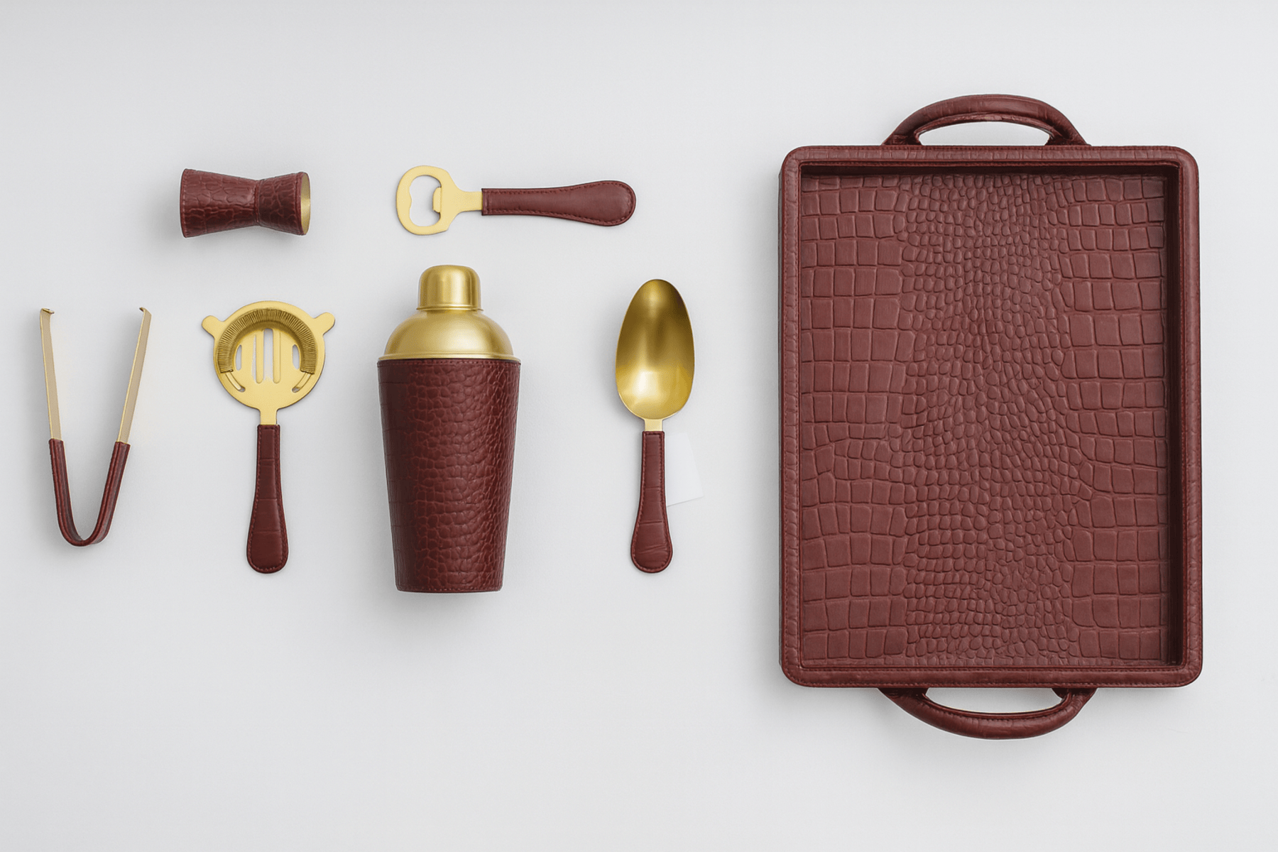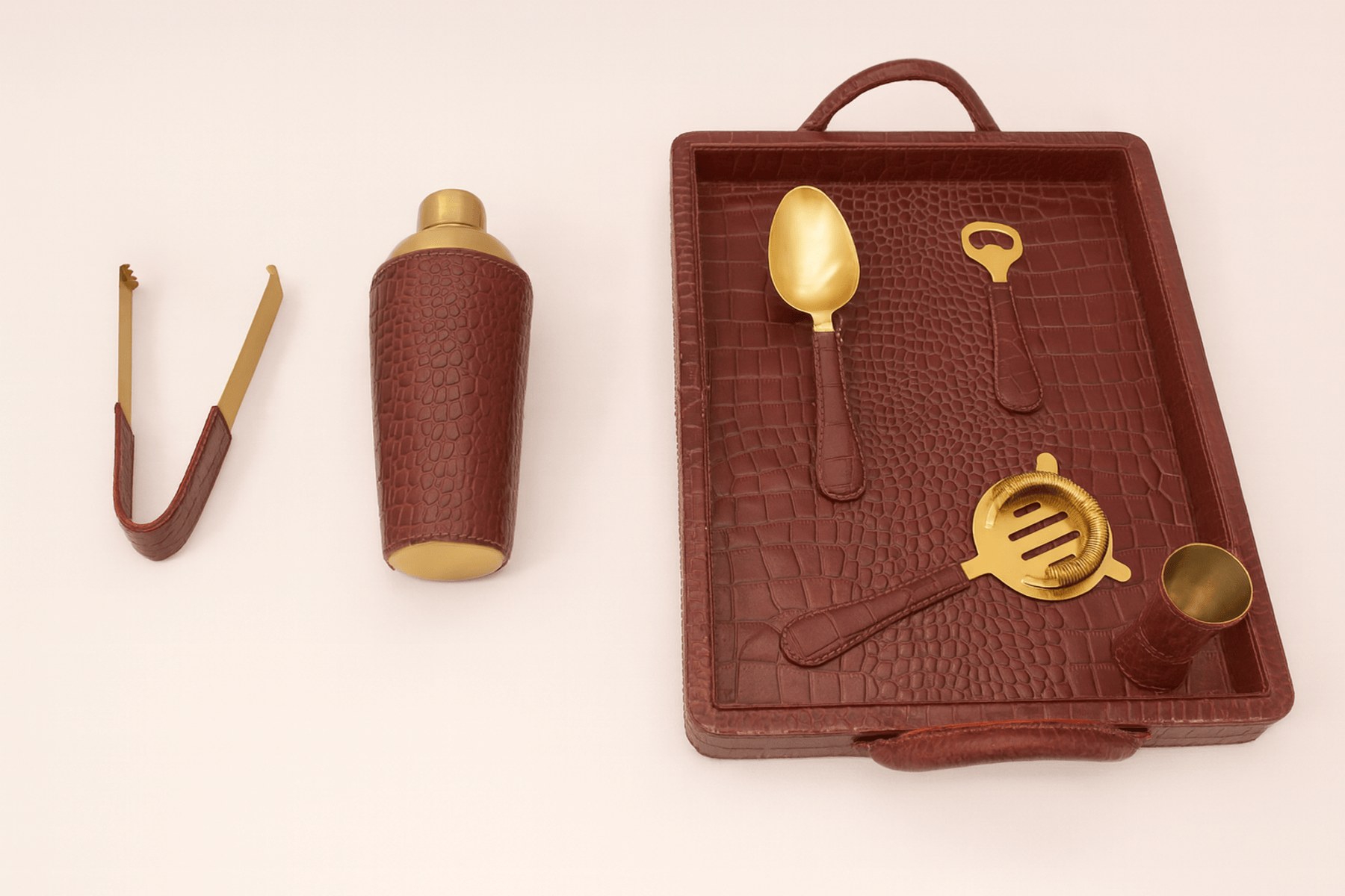 Elegant bar tool set with gold accents and oxblood faux leather finish, complete with matching crocodile-pattern serving tray for luxury entertaining.