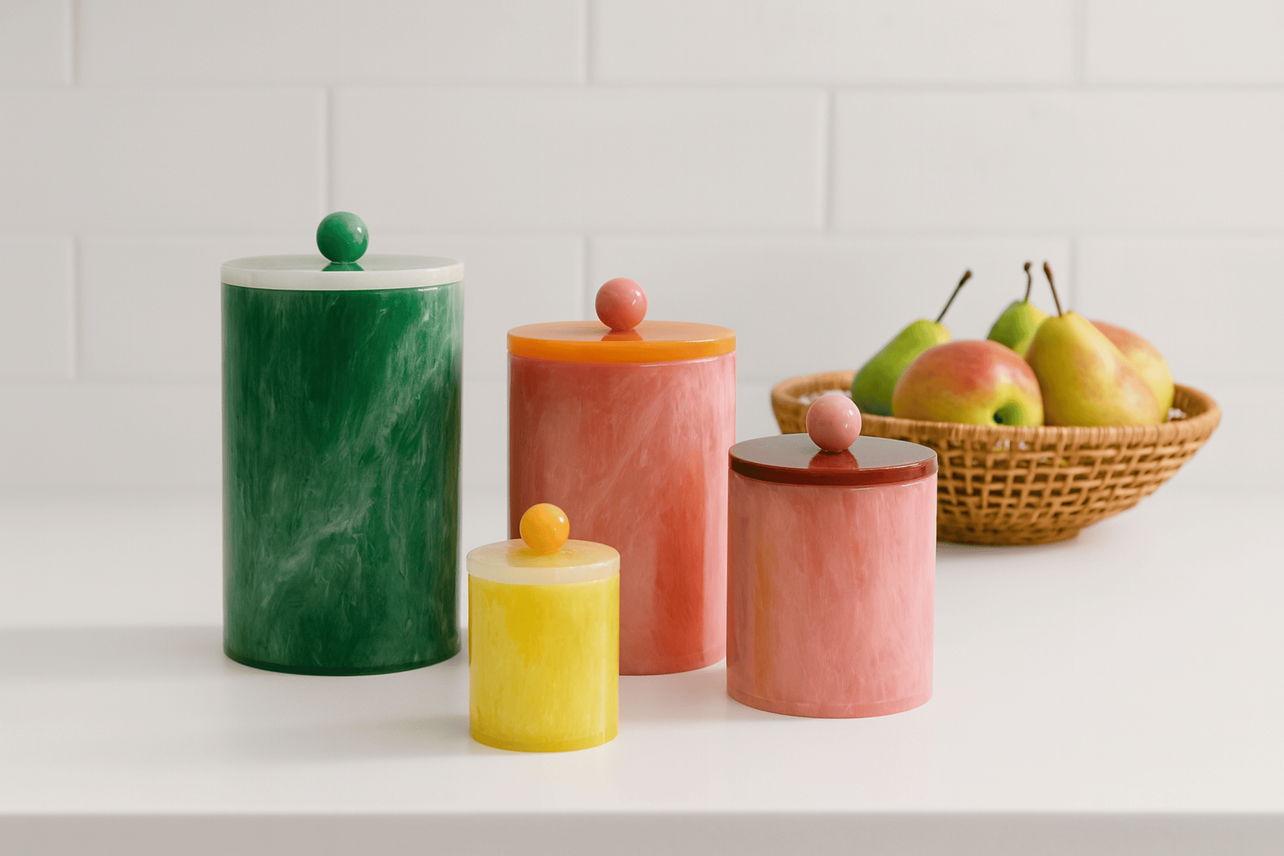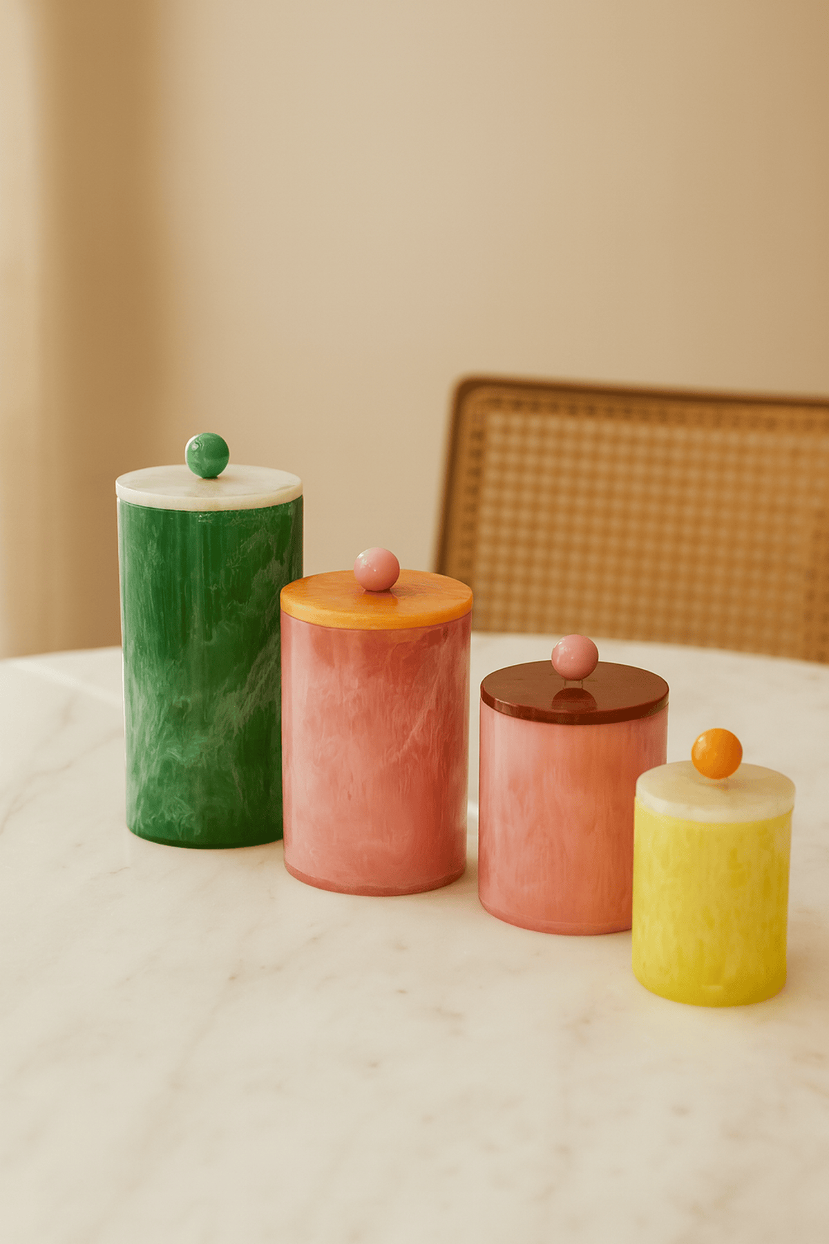 Brighten up your kitchen with the Candy Pop Canisters, a playful yet practical storage solution. Crafted with a glossy marble-like finish in vibrant colors, each canister features a bold contrasting lid with a fun spherical knob for easy handling.