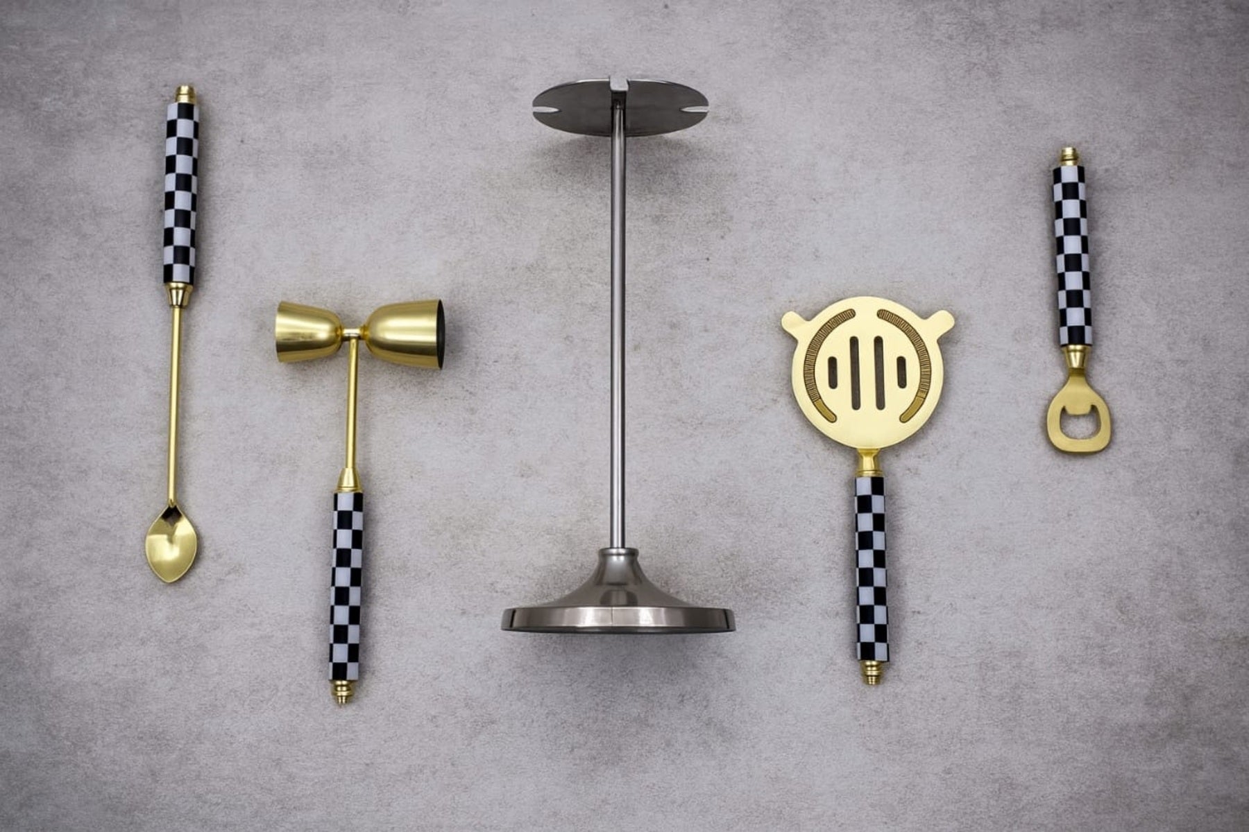 Stylish bar tool set with black-and-white checkered handles and golden finish, designed for modern luxury entertaining.