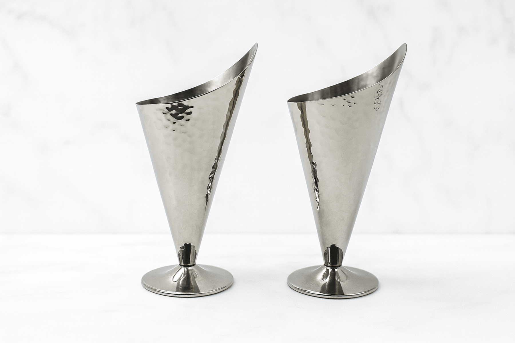 Add a touch of sophistication to your table with these handcrafted hammered metal serve cones. Perfect for serving ice cream, small nibbles, fries, or appetizers, they bring elegance and versatility to any occasion.