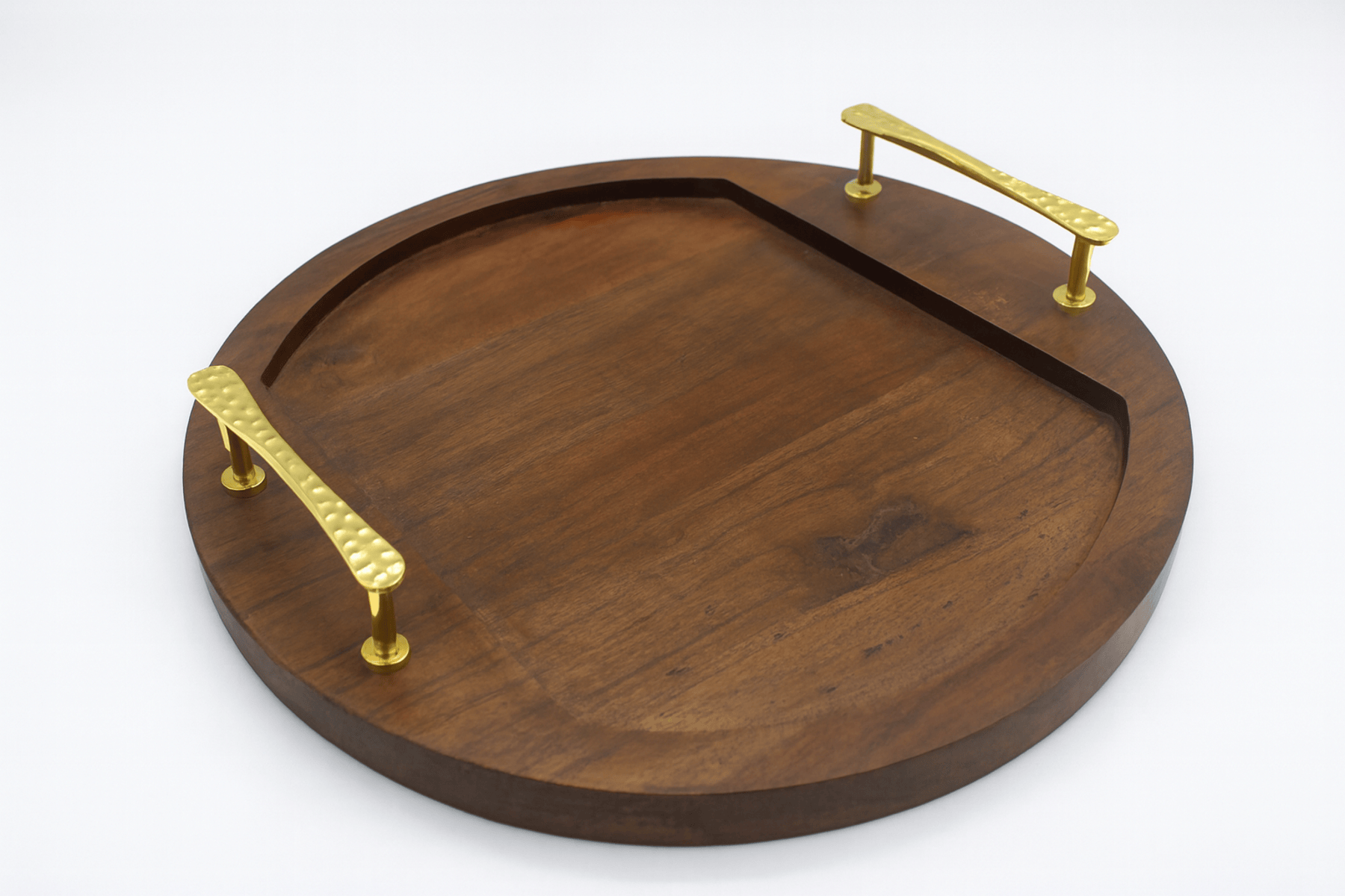 Bring elegance and functionality to your hosting with this handcrafted round wooden serving tray. Made from rich, durable wood, it features a smooth finish and beautifully hammered gold-toned handles that add a touch of luxury.