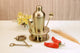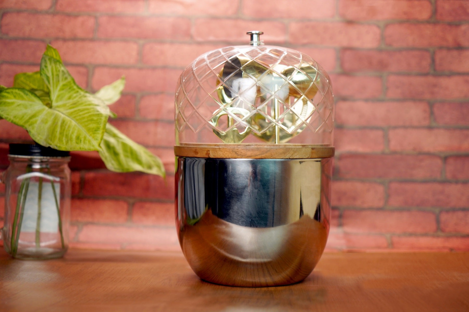 Luxurious stainless-steel ice bucket set with golden bar tools and wooden lid, perfect for elegant gatherings.